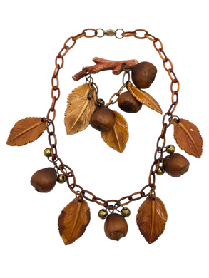 1940s Cinnamon Brown Acorn and Leaf Necklace and Brooch Set