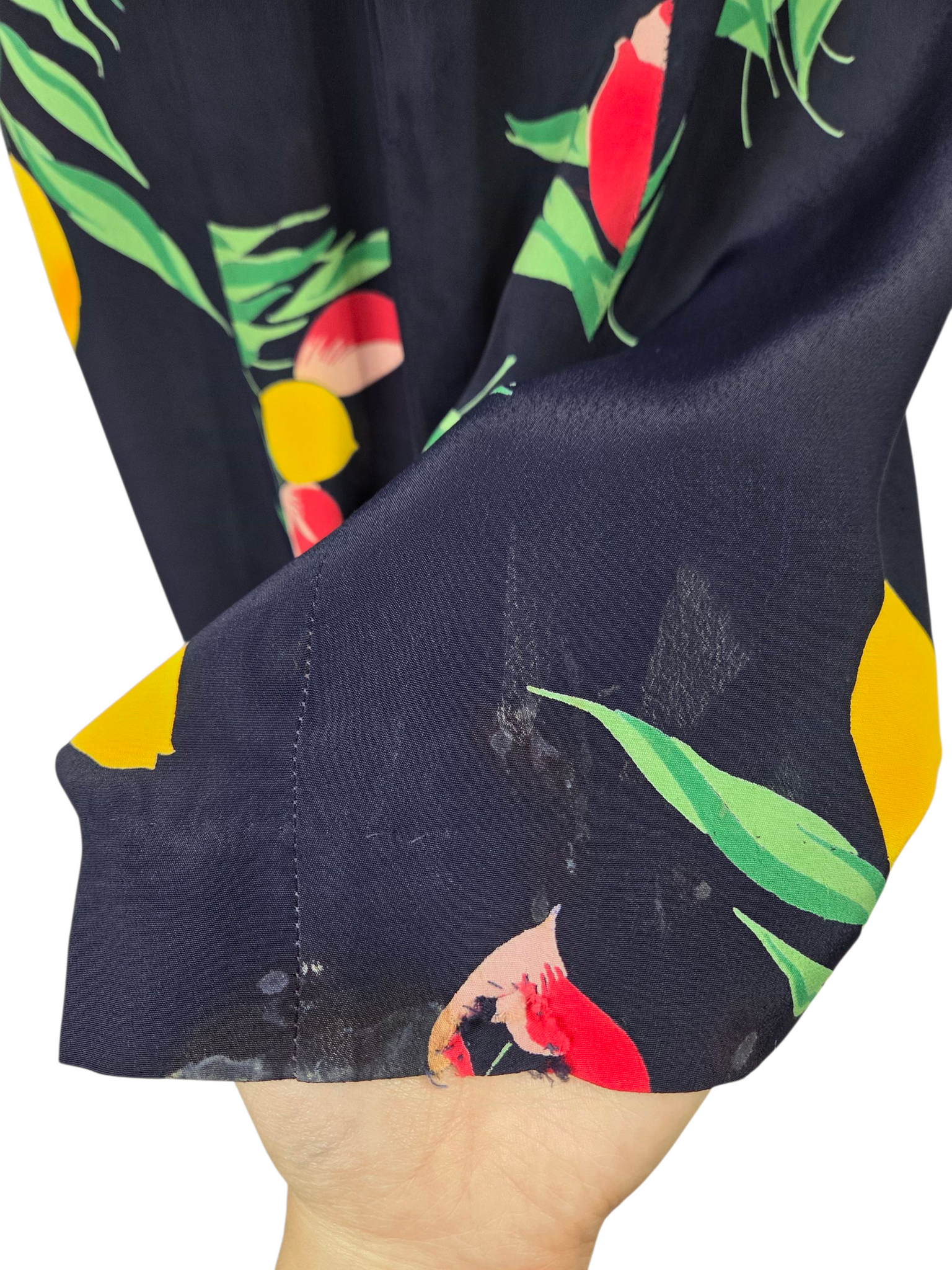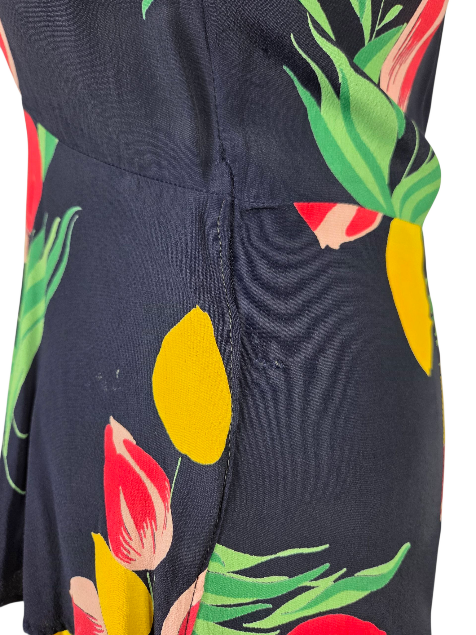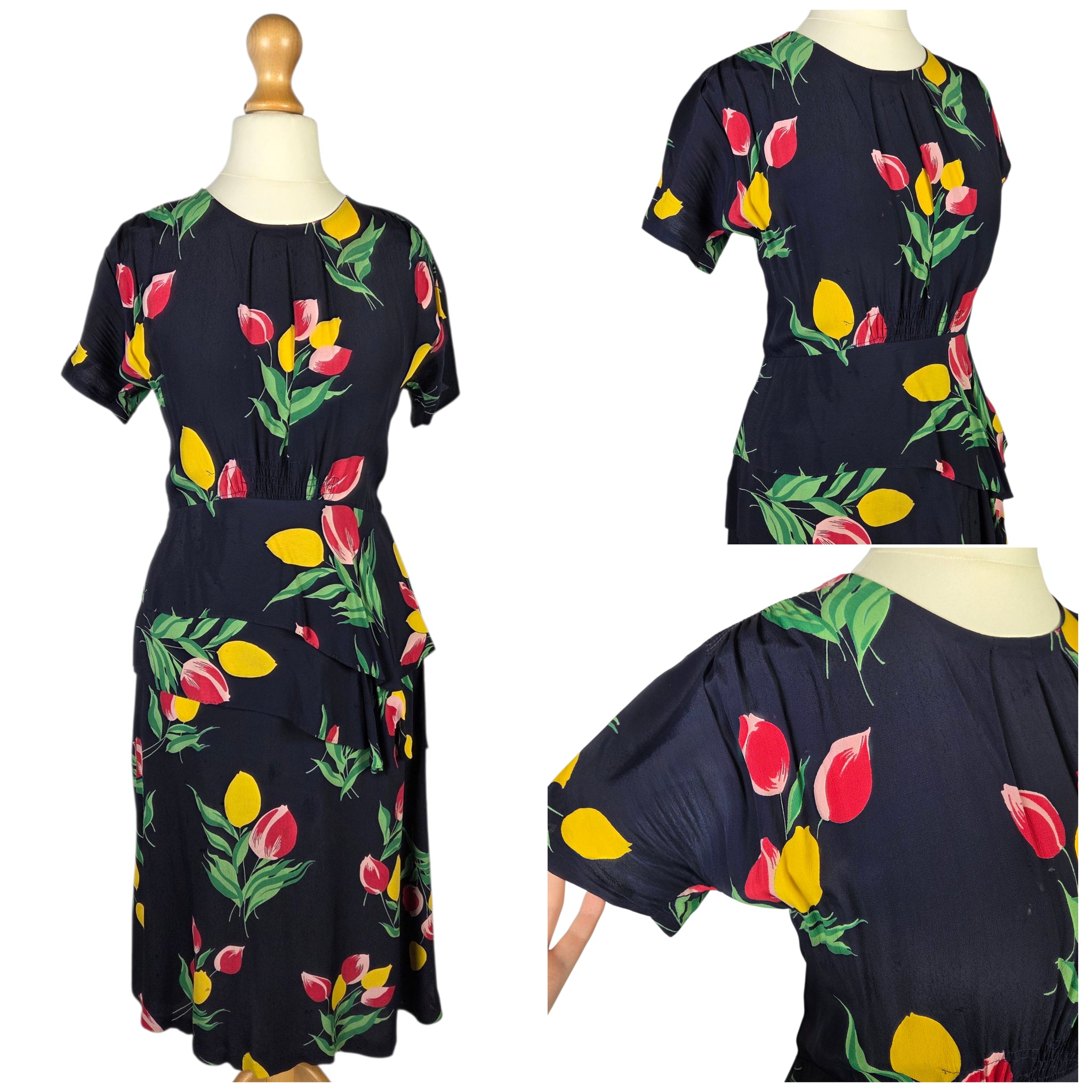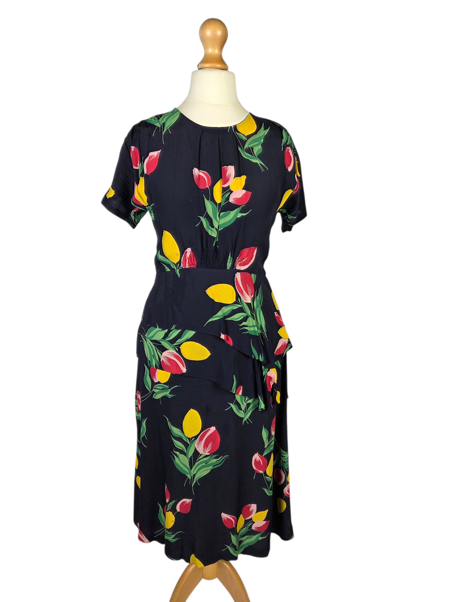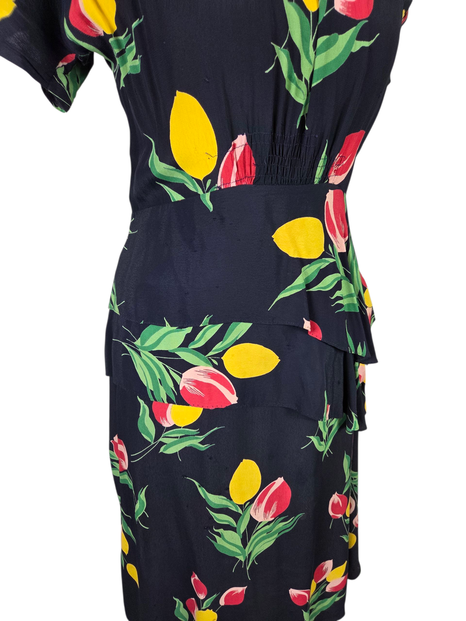 1940s Navy Blue and Multicoloured Tulip Peplum Dress