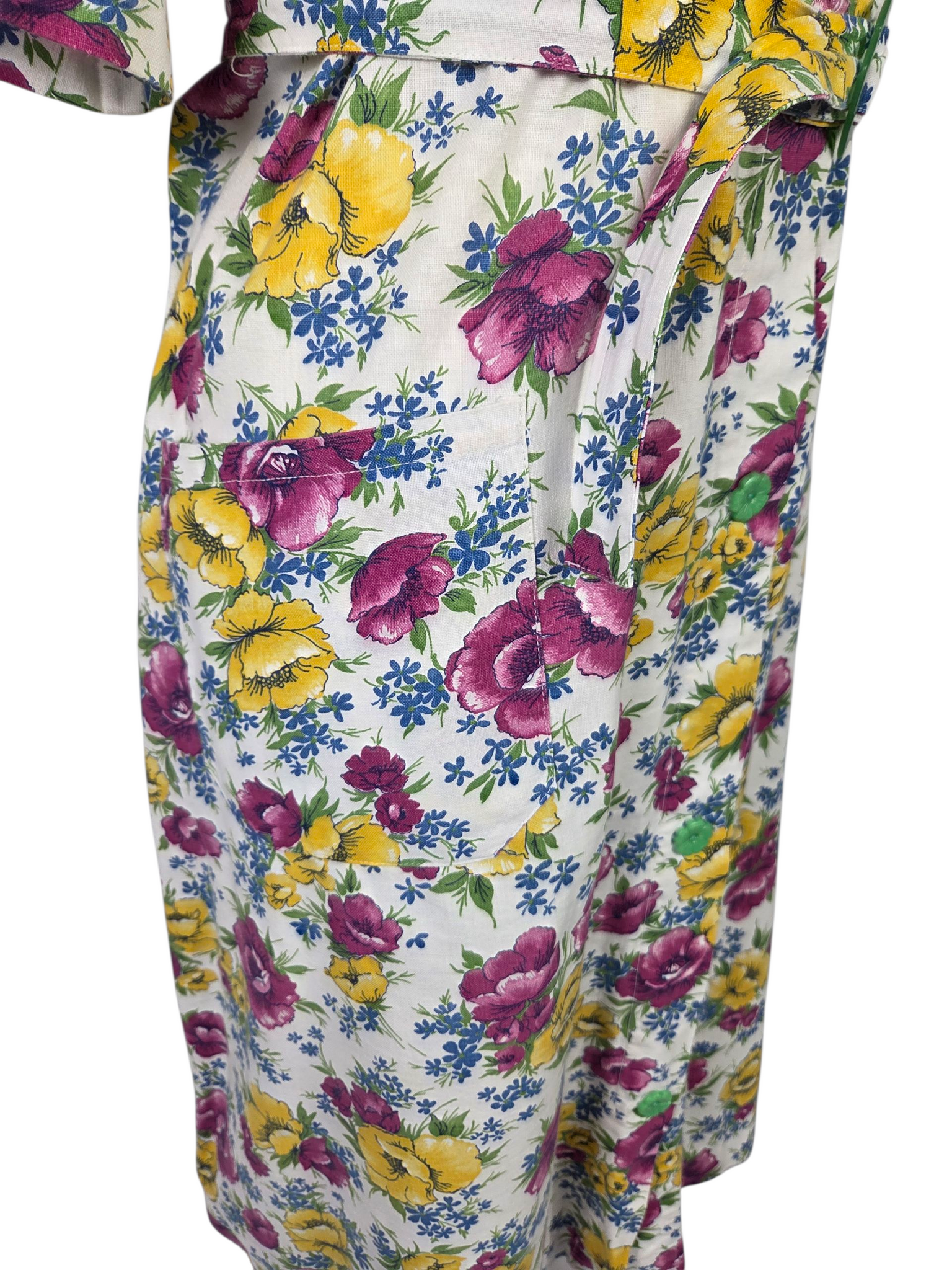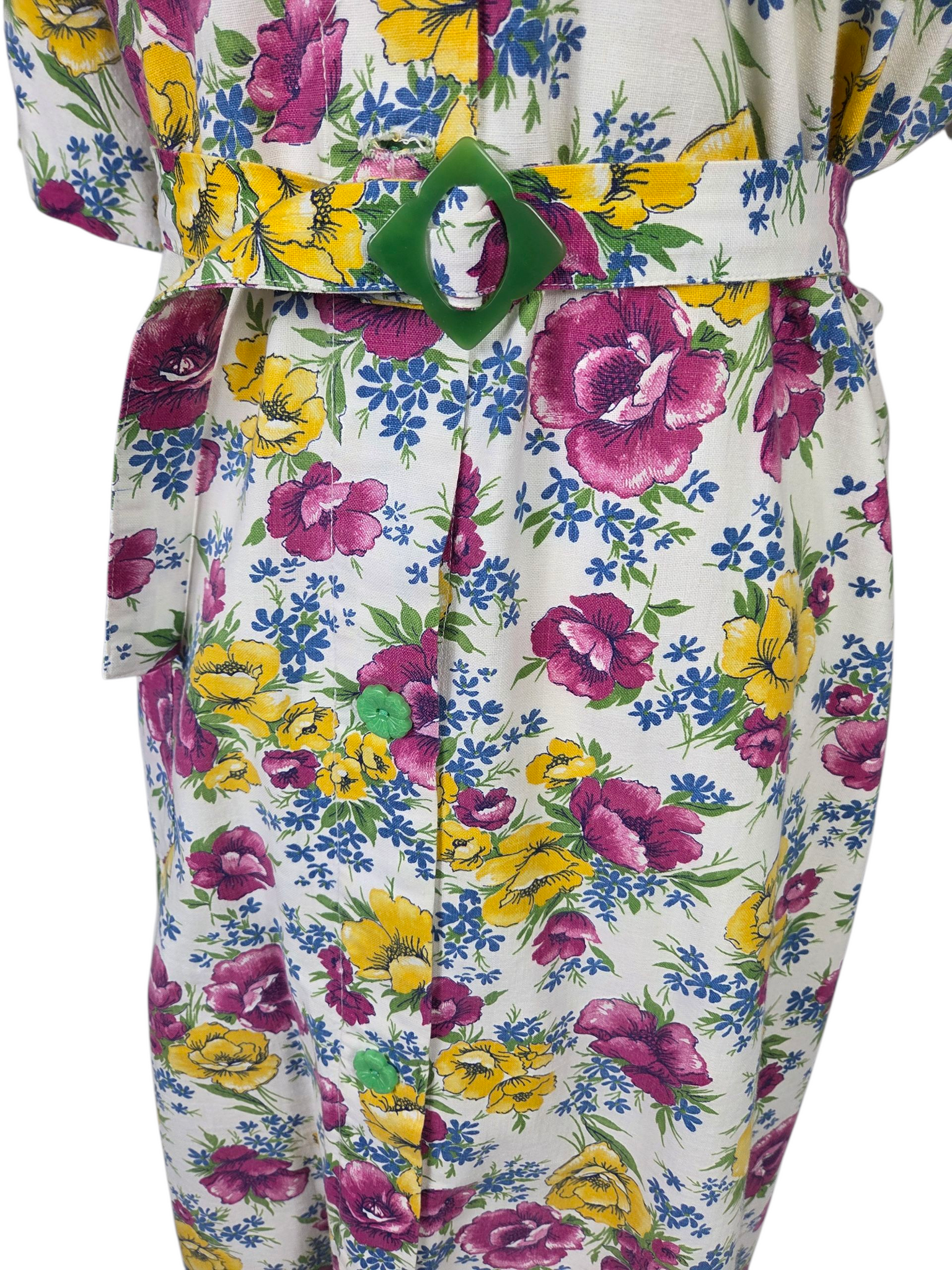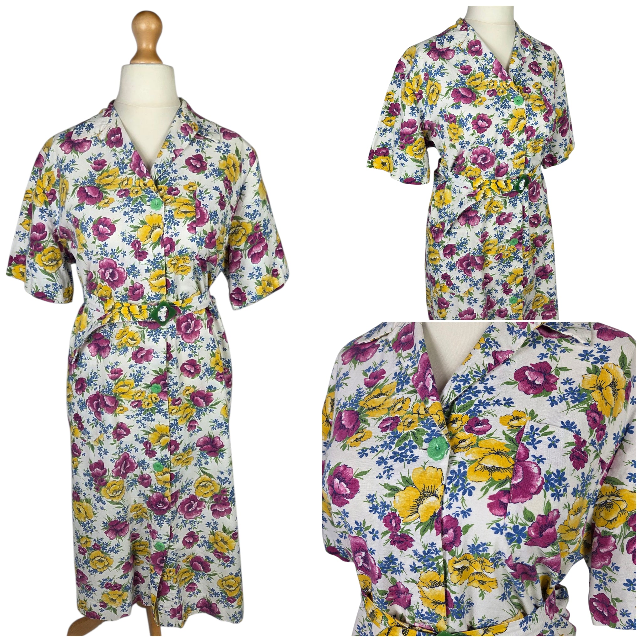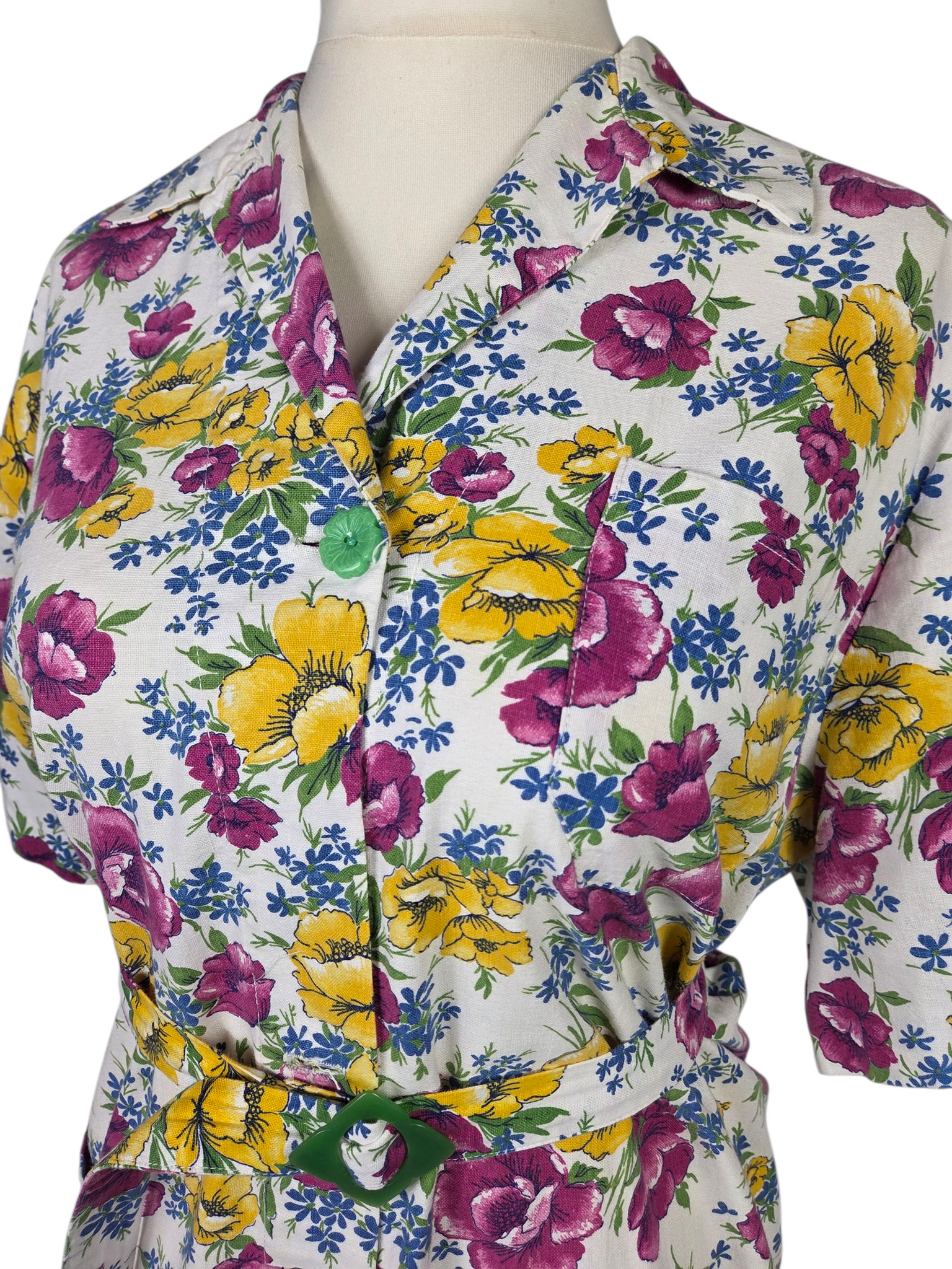 1940s Yellow and Burgundy Floral Shirtwaister Dress With Green Buttons and Buckle