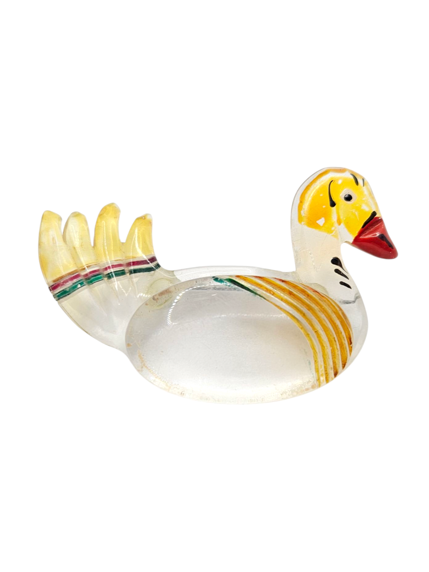 Good, some wear, paint loss, belly is a bit cloudy, chip at the top of his back