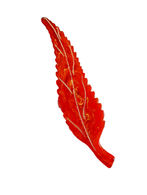 1940s Red Carved Curved Marbled Bakelite Leaf Brooch