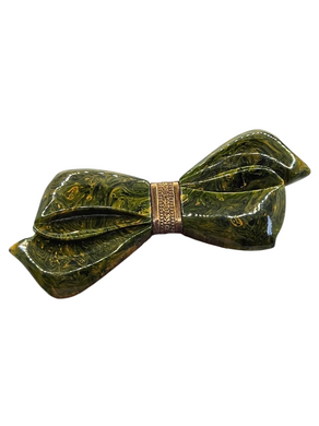 1940s Carved Marbled Green Bakelite and Metal Bow Brooch