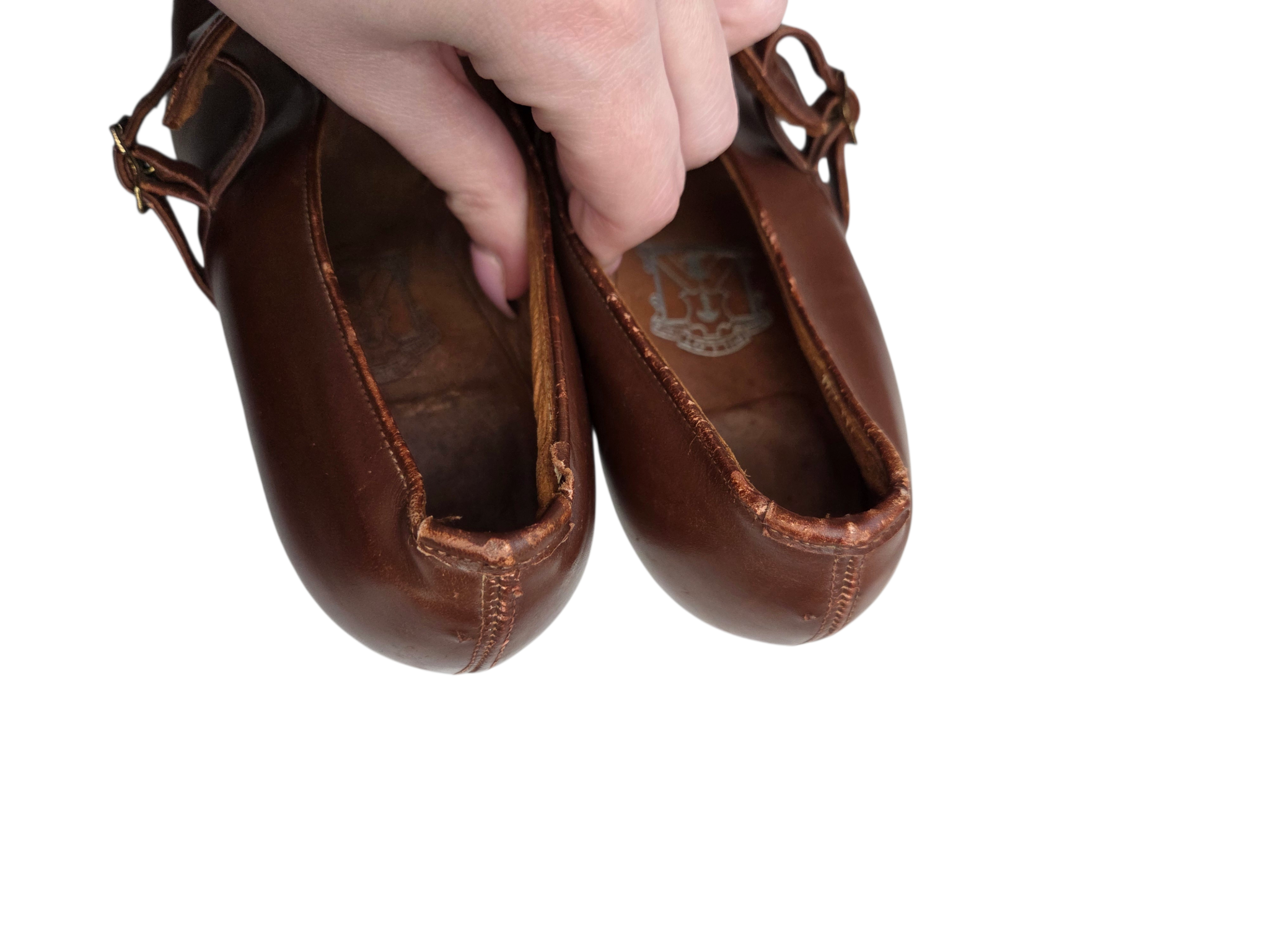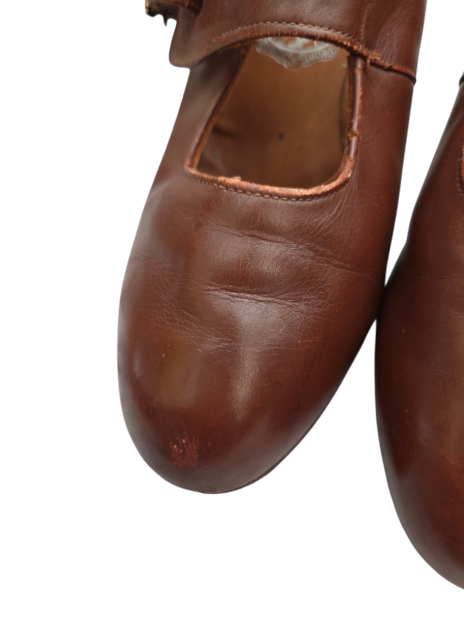 Good, a few scuffs, some cracks to the buckle, random punched holes in one shoe, need a good polish