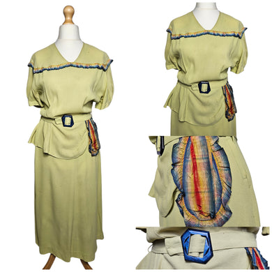 1940s Chartreuse Green Crepe Dress With Blue Galalith Buckle and Rainbow Sash