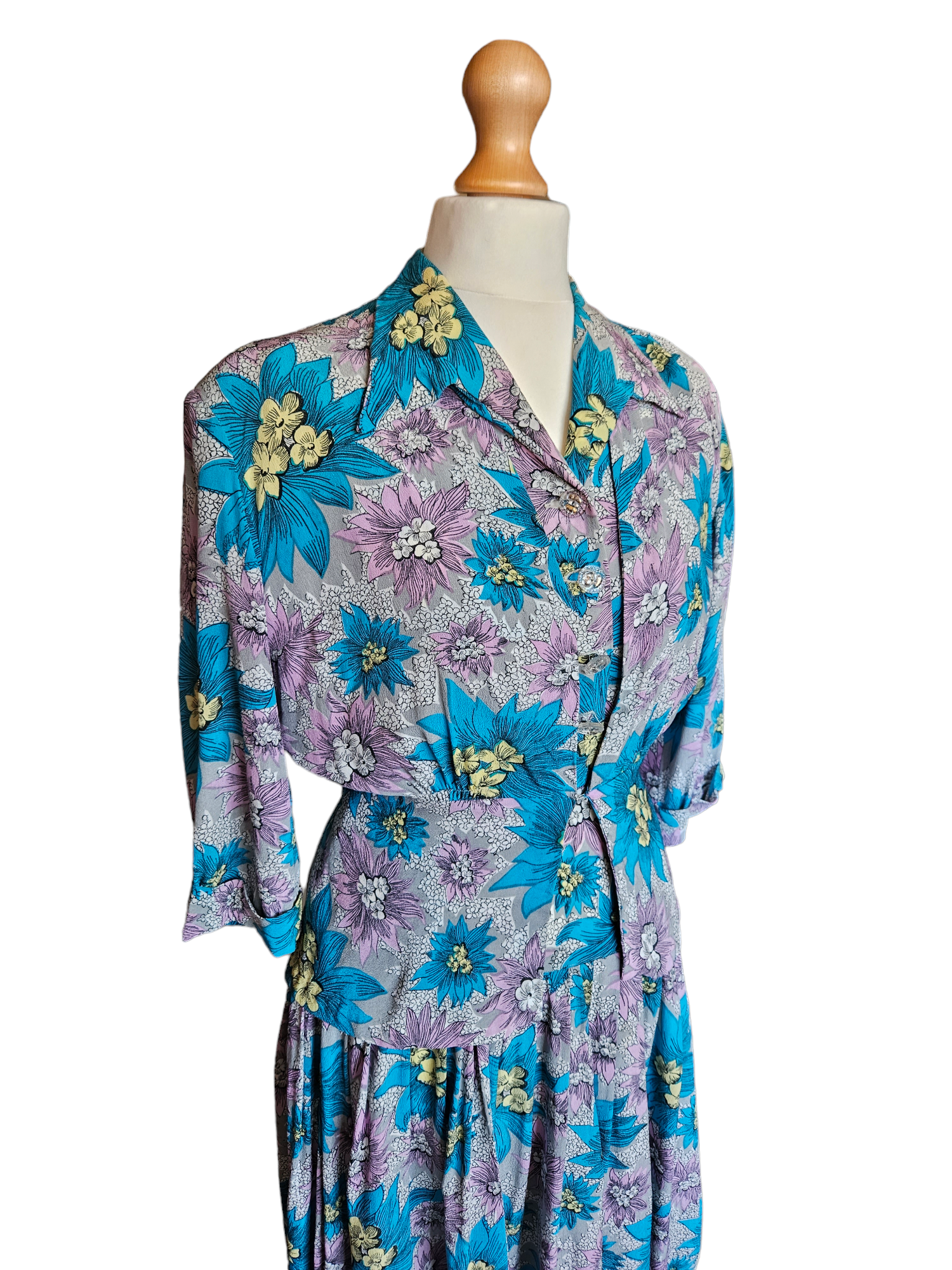 • Load image into Gallery viewer, 1940s CC41 Teal, Lilac and Yellow Crepe Dress and Jacket Set